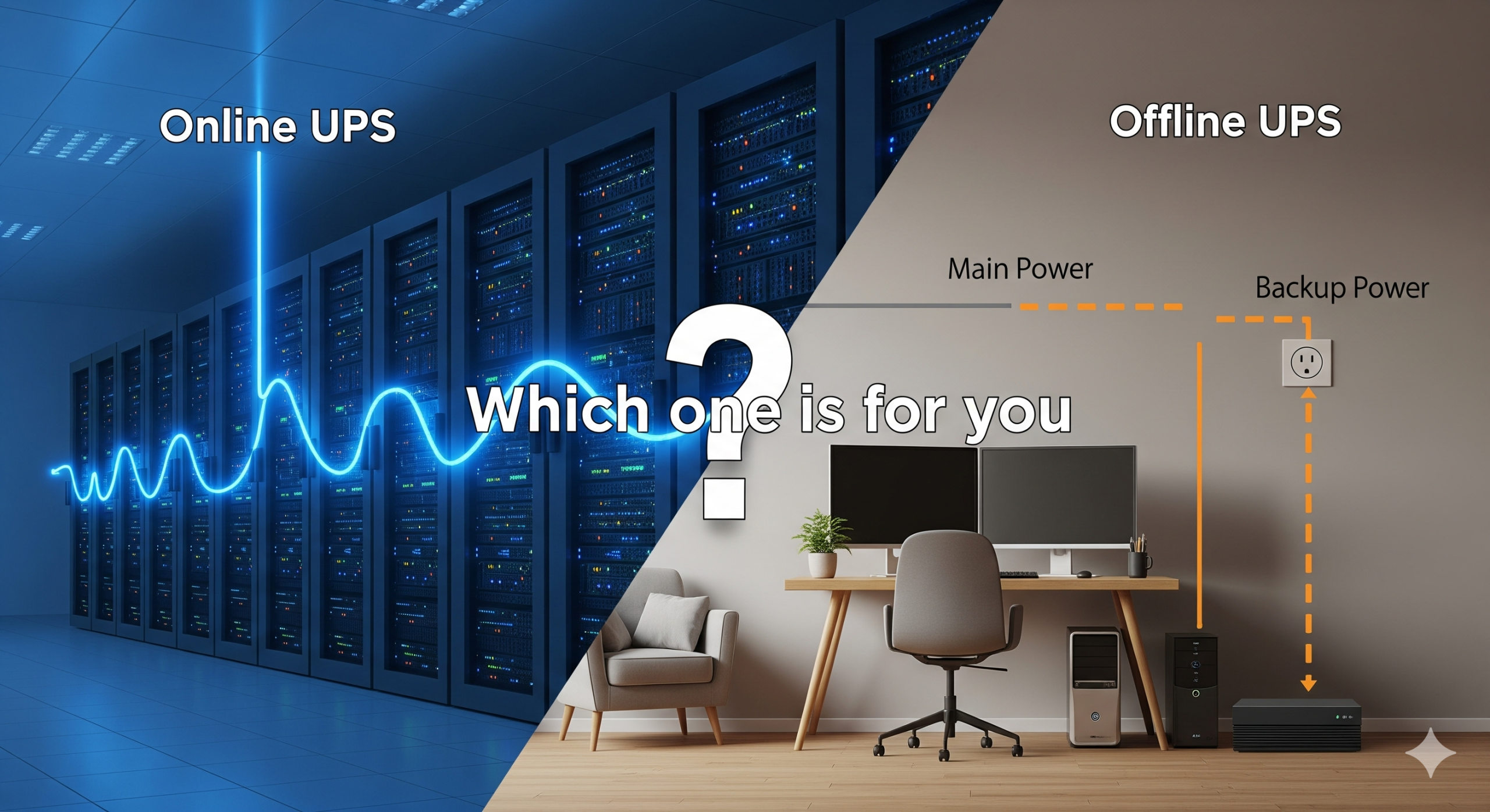 Industry Insight: Break down the common confusion between different types of Uninterruptible Power Supply (UPS) systems. Explain the key difference between Online UPS Solutions and Offline/Standby UPS systems in simple terms, focusing on how each handles power during normal operation and during an outage.